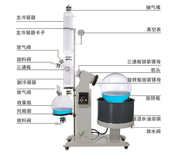 蒸餾燒瓶,但具有標準研磨口接口的梨形或圓形底燒瓶通過高度回流蛇形冷凝器管與減壓泵連接,回流冷凝器管與研磨瓶連接,用于接收蒸發的有機溶劑。在冷凝管與減壓泵之間有13通活塞,當體系與大氣相通時,可以將蒸餾燒瓶,接液燒瓶取下,轉移溶劑,當體系與減壓泵相通時,則體系應處于減壓狀態。使用時,應先減壓,再開動電動機轉動蒸餾燒瓶,結束時,應先停機,再通大氣,以防蒸餾燒瓶在轉動中脫落。作為蒸餾的熱源,常配有相應的恒溫水槽。